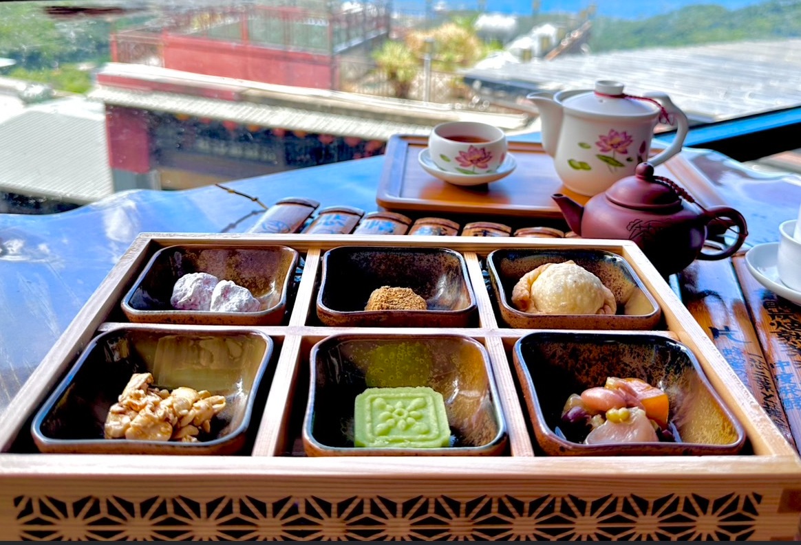 「六趣茶菓」は、九份を代表する伝統と季節感を表現した、阿妹茶樓オリジナルの創作茶菓子セット。六つの異なる風味を一度に味わえる贅沢なセレクションとなっており、無農薬の高山烏龍茶(ホット・アイス選択可)とともに提供されます。