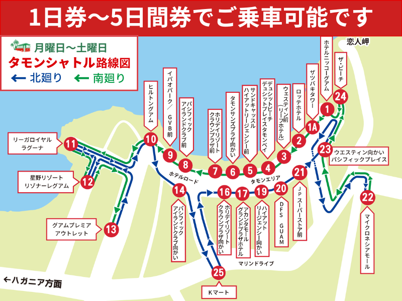 ※チャモロビレッジナイトマーケットシャトル、デデド朝市シャトル、恋人岬サンデーシャトルの路線はご利用いただけません。
