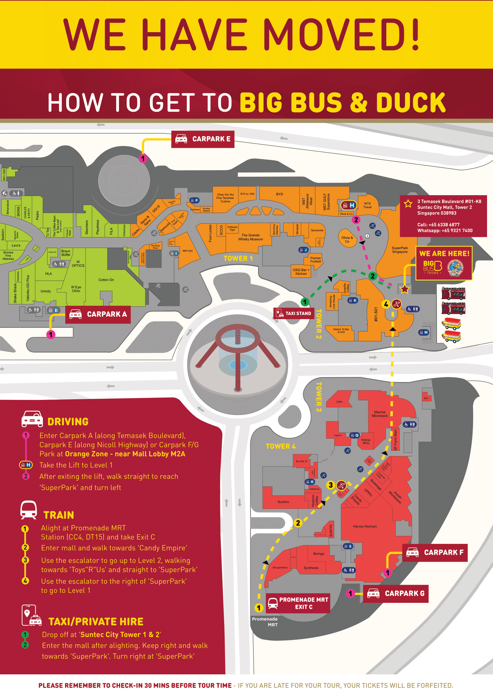 | 09:30 | サンテックシティモール(タワー2)内、1階のダックツアーカウンターに集合、ご自身でチェックイン。(*予約バウチャーをご提示ください) |
