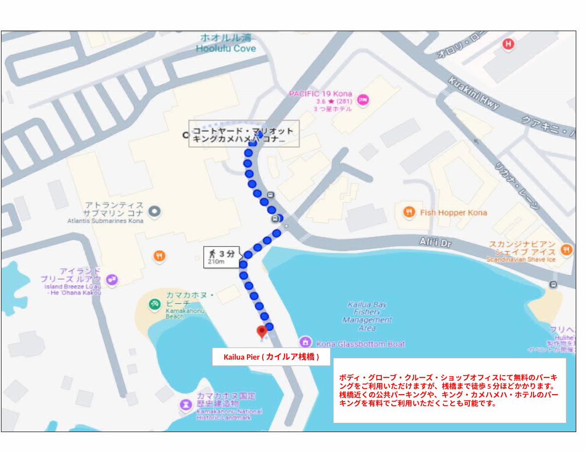 ボディ・グローブ・クルーズ・ショップオフィスにて無料のパーキングをご利用いただけますが、桟橋まで徒歩5分ほどかかります。