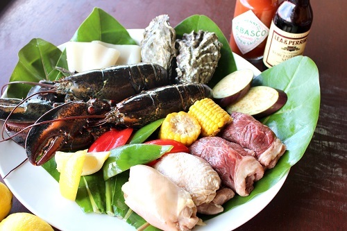 | 料金に含まれるサービス | <<大人メニュー>> ロブスターテール、サーロインステーキ、チキン、海老、野菜、サラダバー食べ放題、生ビール・ソーダ・アイスティー飲み放題 <<キッズメニュー>> サーロインステーキ、ホットドック(ウインナーソーセージ)、海老、野菜、アイスクリーム、サラダバー食べ放題、ソーダ・アイスティー飲み放題 |