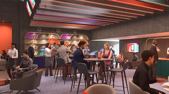 活気に満ちた雰囲気の中で、エネルギーと快適さのバランスを追求した空間。ユニークなホスピタリティエリアからすぐ近くの席で、プレミアムなサービスや設備にもスムーズにアクセス可能。