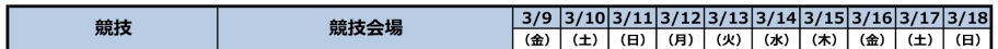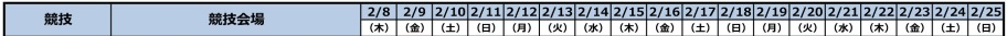 下記のスケジュール表の競技名または競技会場名をクリックすると、詳細スケジュールをご確認いただけます。 ※平昌オリンピックの競技スケジュールはこちら