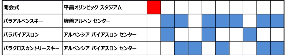パラクロスカントリースキー、パラバイアスロンなどが行われる平昌マウンテン クラスターと、車いすカーリング、パラアイスホッケーが行われる江陵コースタル クラスターの大きく分けて2エリアで10日間にわたり競技が行われます。