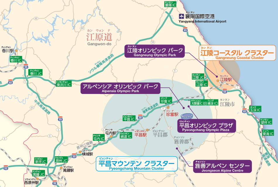 スキーやスノーボード、ソリ、ジャンプ競技などが行われる平昌マウンテン クラスターと、スケート競技が行われる江陵コースタル クラスターの大きく分けて2エリアで18日間にわたり競技が行われます。