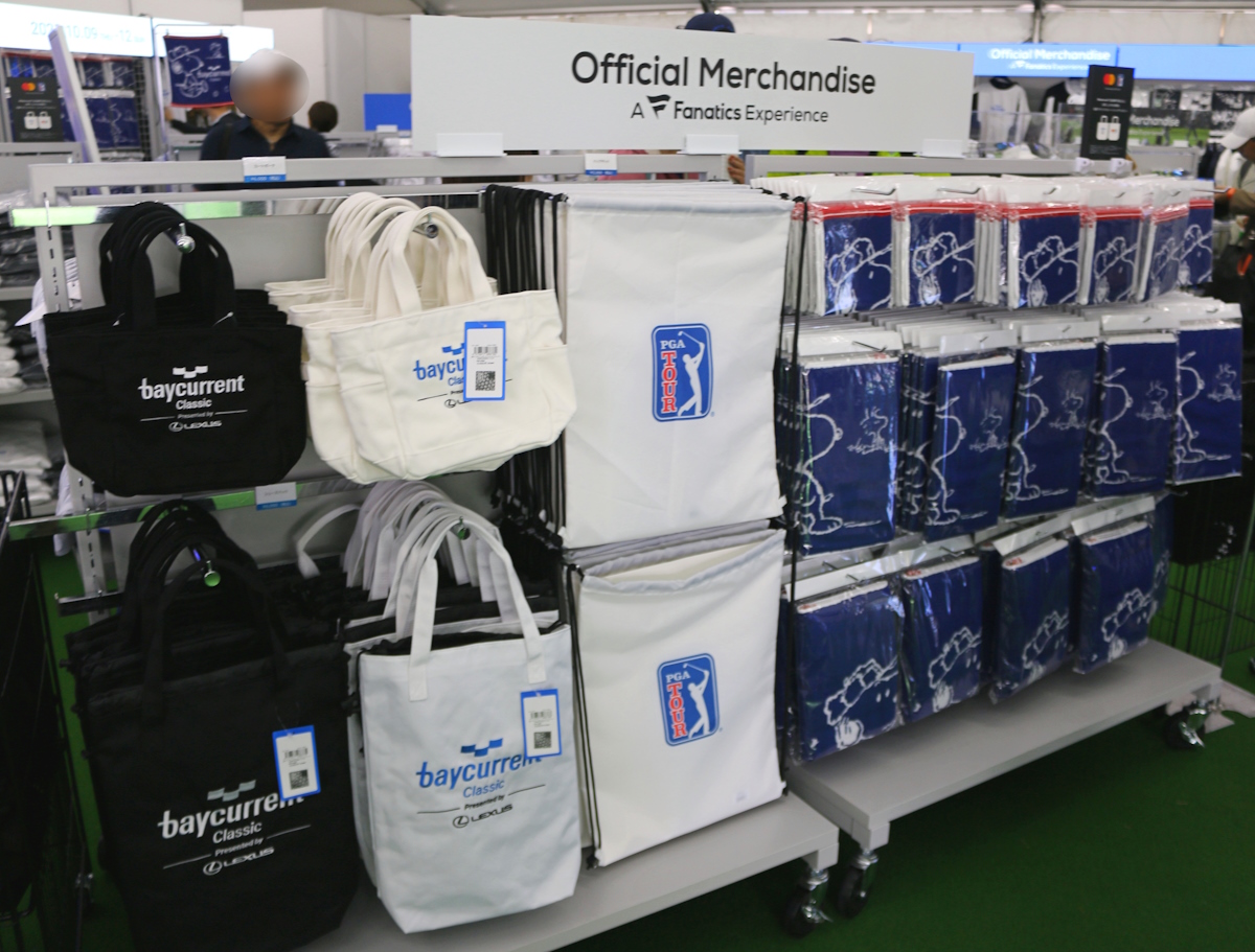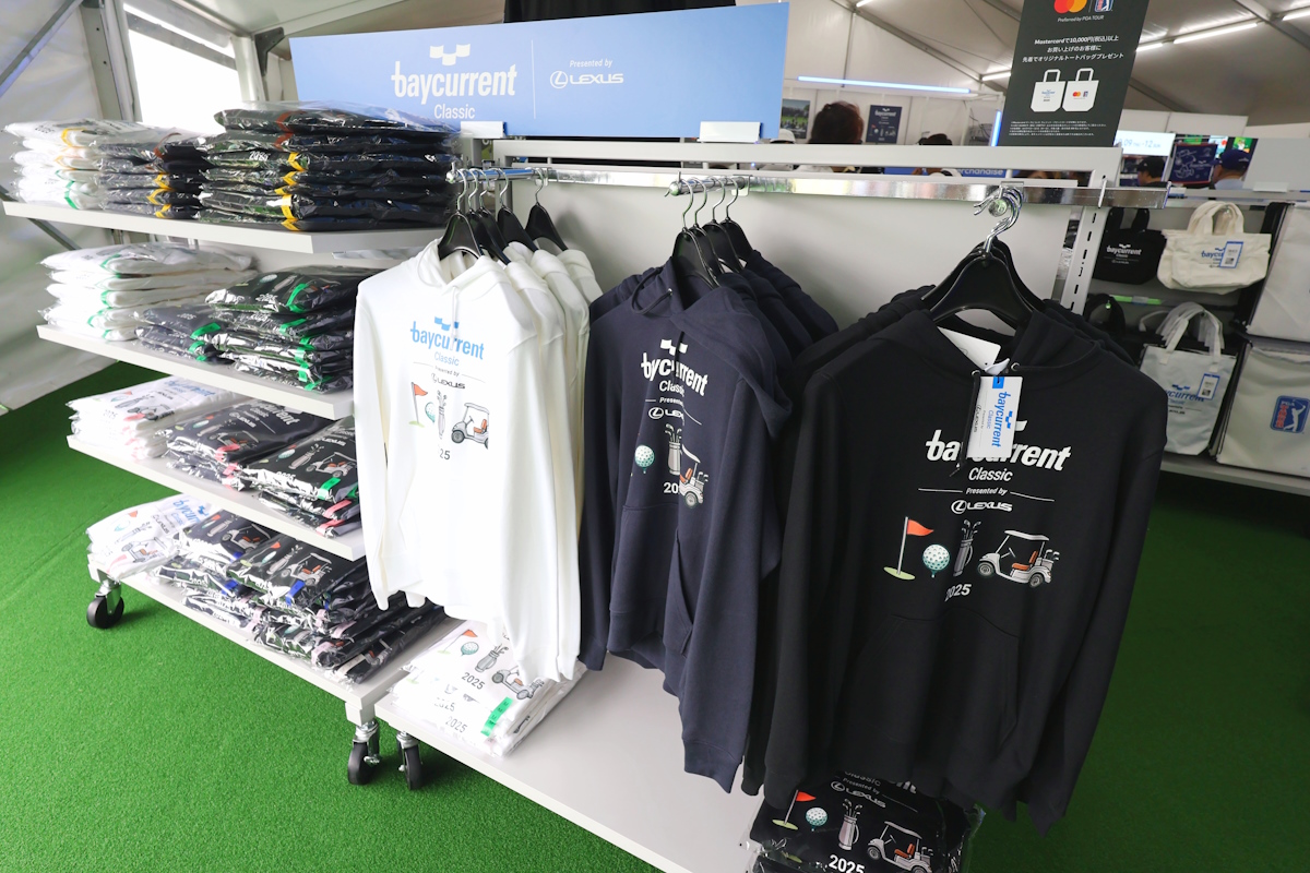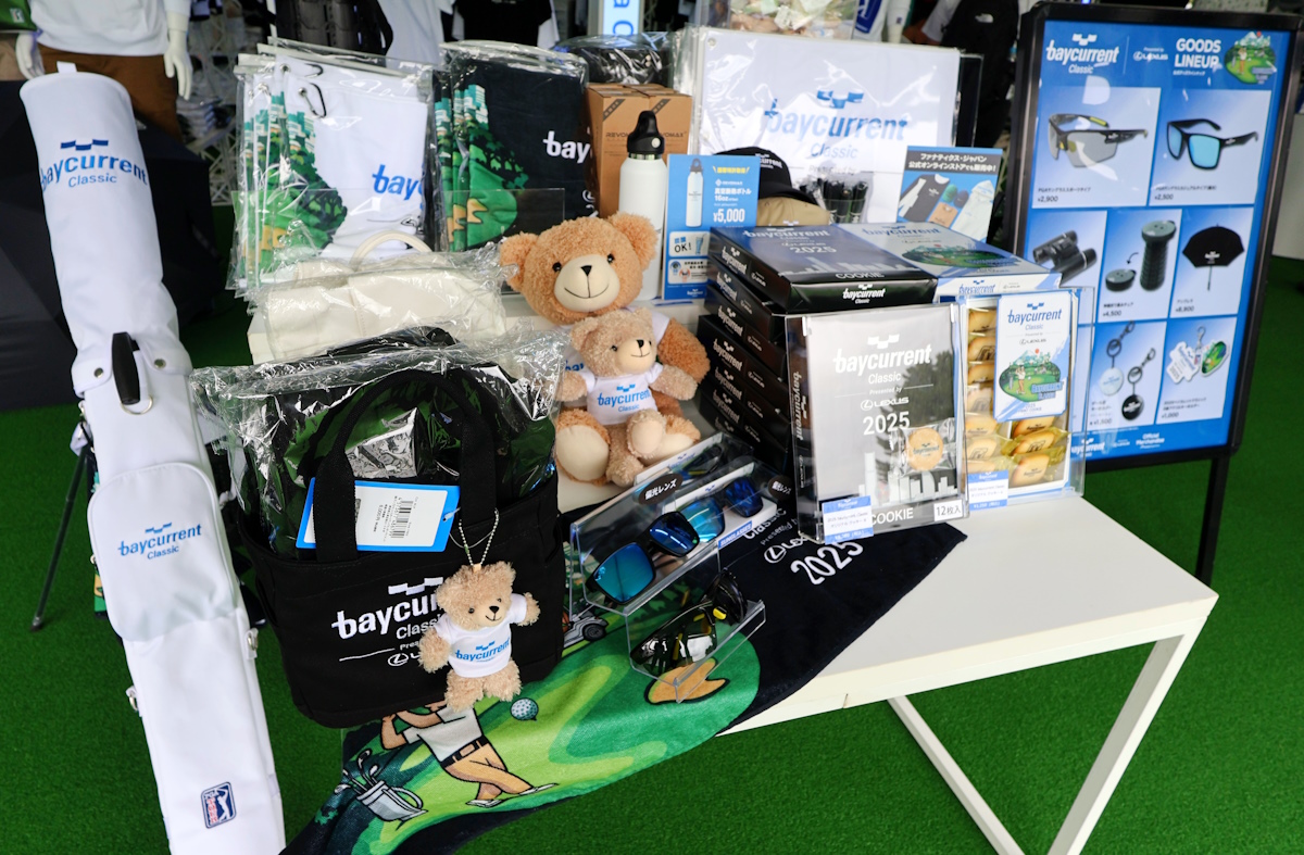 スタッフがまず注目したのが、会場中央のオフィシャルグッズ販売。大会ロゴをあしらったゴルフ用品は、ゴルフ愛好家であれば思わず買いたくなるものばかり。