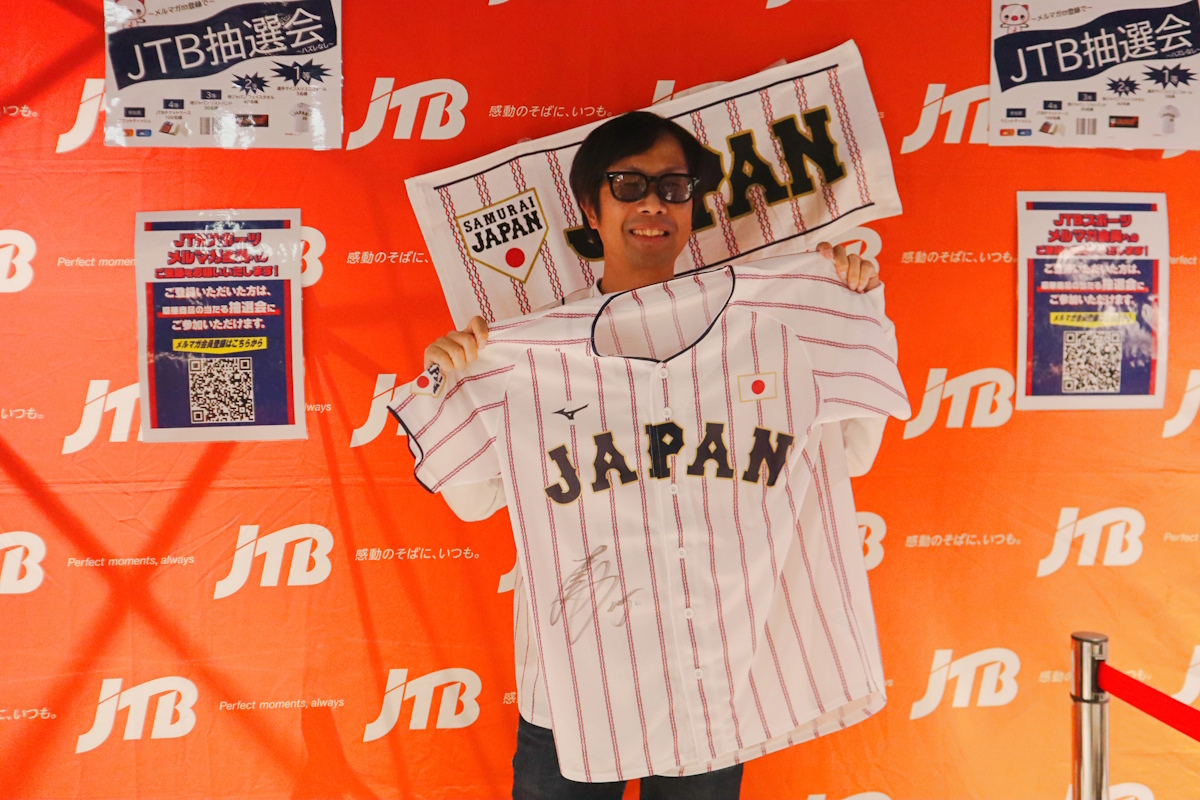 侍ジャパンのフェイスタオルやリストバンドなど豪華賞品が当たるとあって、試合前から大盛況でした。1等はなんと侍ジャパン選手のサイン入りユニフォームをプレゼント!見事1等に当選された方をパチリ。おめでとうございます!