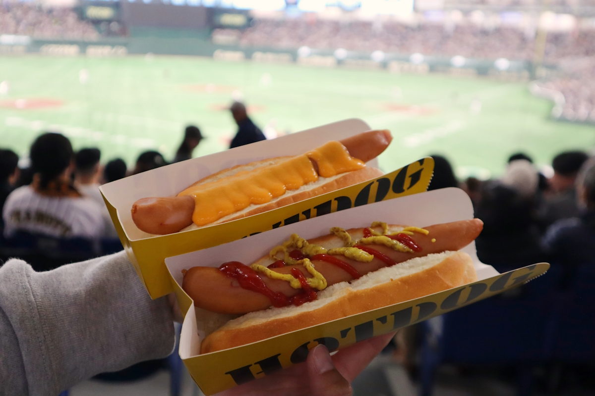 観戦にぴったりなのがワンハンドでいただける「東京ドームドッグ」600円と「チーズドック」680円。できたてアツアツ、絶品です。