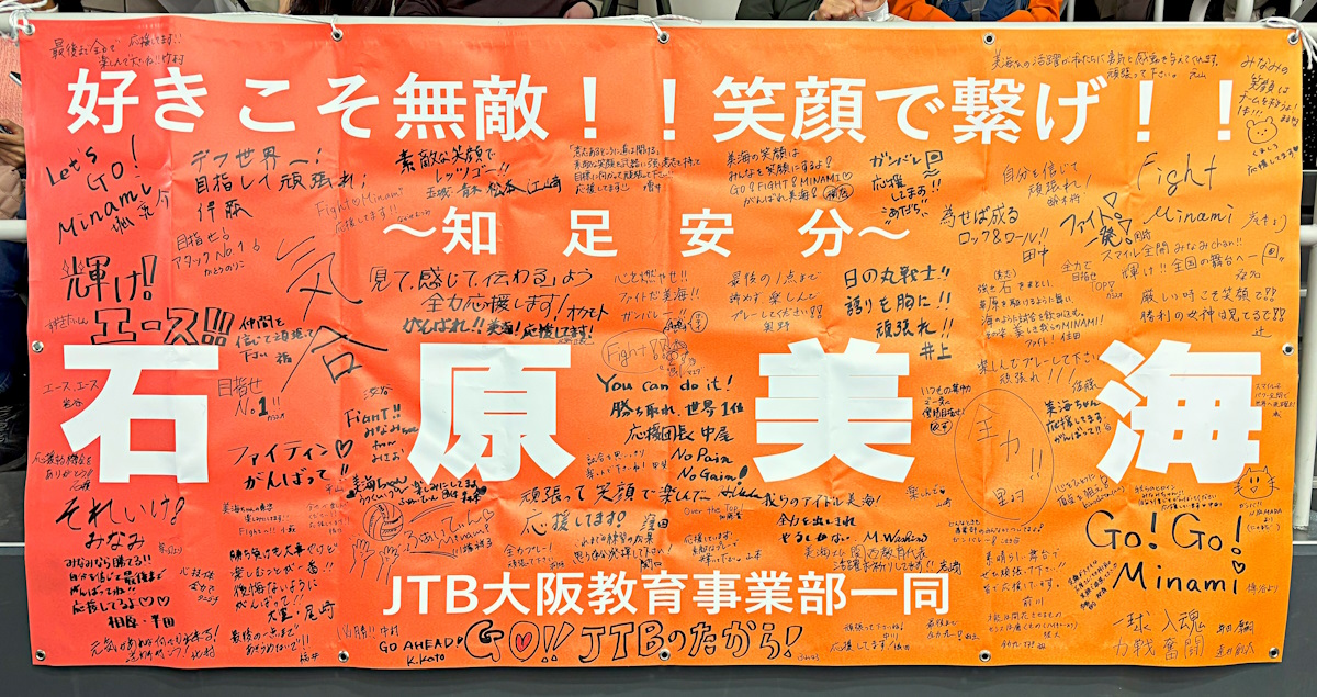 JTB大阪の教育事業部に所属する石原選手には、こんな横断幕も! 熱いメッセージがたくさん寄せられていて、石原選手が社内でも愛されていることが伝わってきます。
