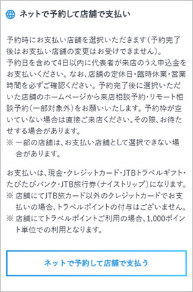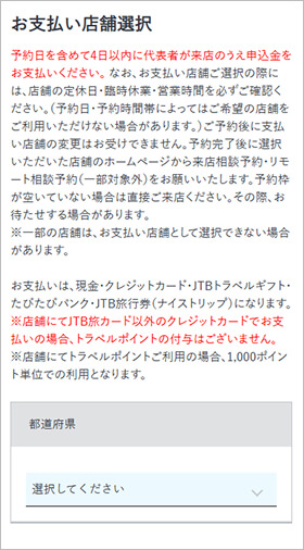 ※店舗にてJTB旅カード以外のクレジットカードでお支払いの場合、トラベルポイントの付与はございません。店舗にてトラベルポイントご利用の場合、1,000ポイント単位での利用となります。