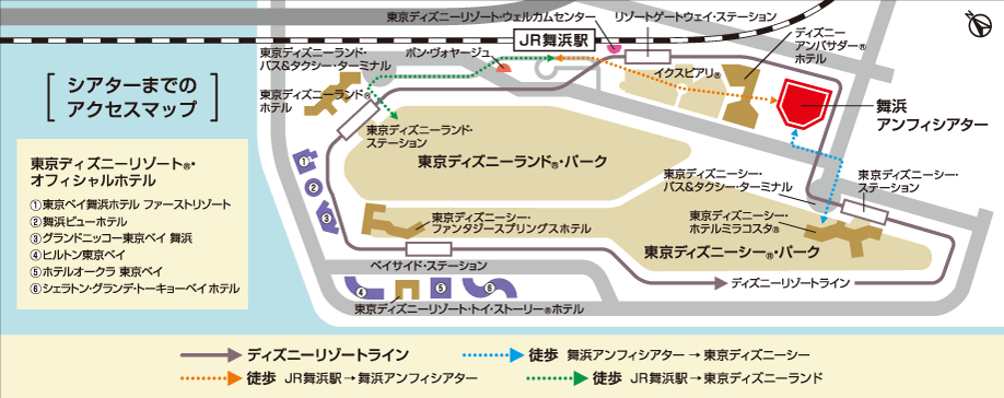 電車:JR京葉線・武蔵野線「舞浜」駅南口よりイクスピアリ館内、