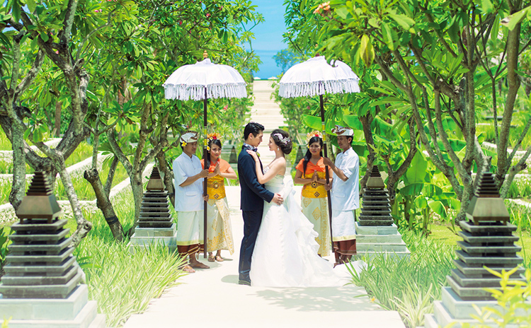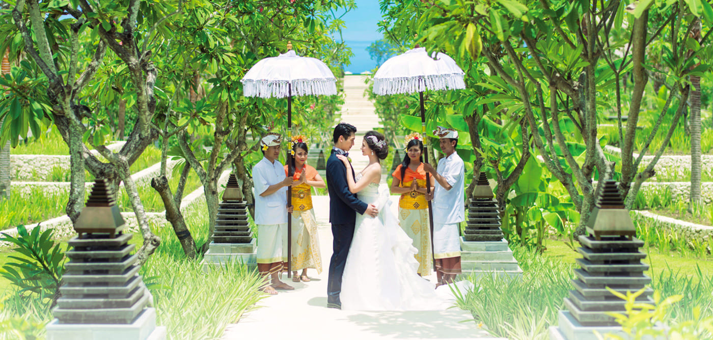 神聖な雰囲気の上質な海外ウエディングが叶うバリ島。東南アジアならではのゆったりとした時間の中で、ラグジュアリーなホテルステイも楽しめる。