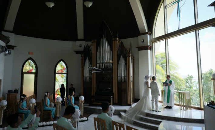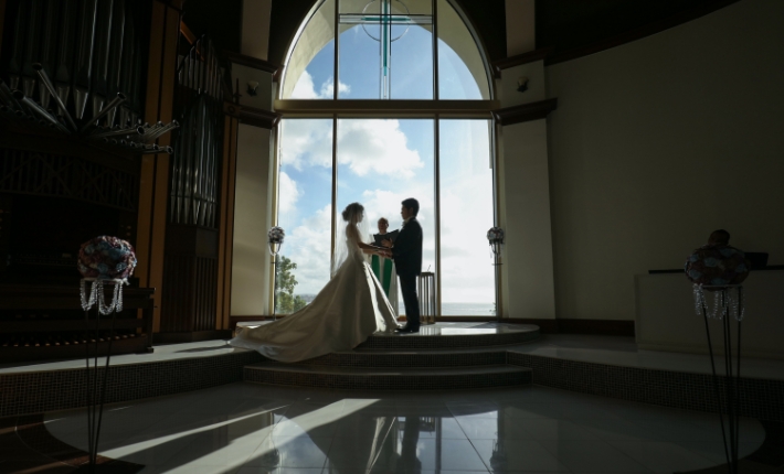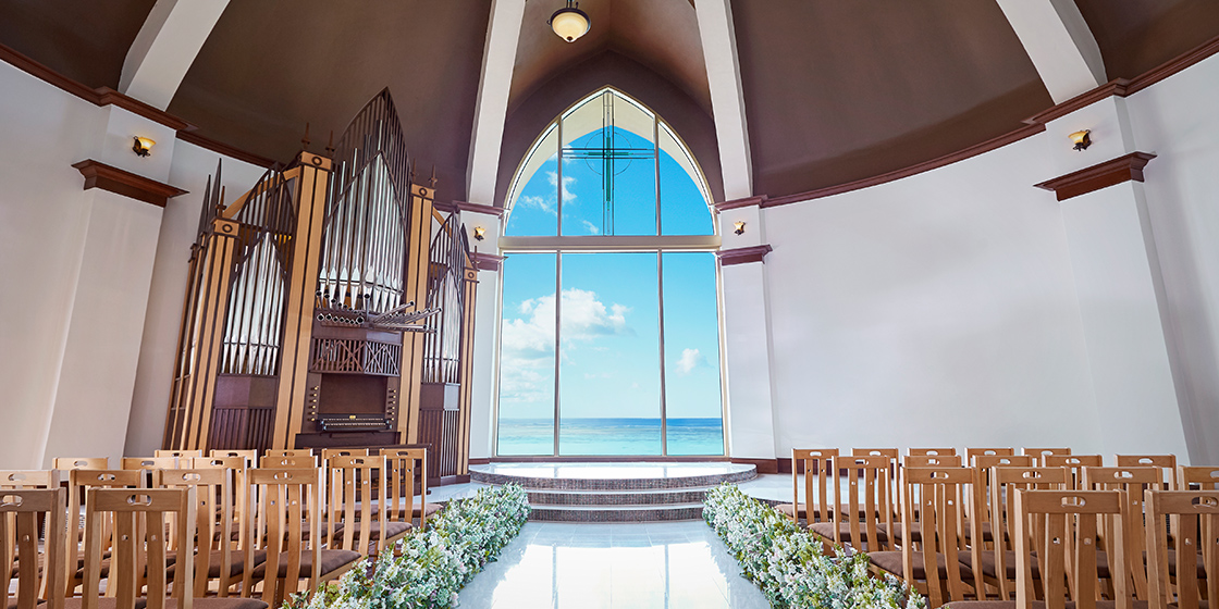 オーシャンフロントの絶好の立地にあるロッテホテルグアム。その施設内にある、美しい音色を奏でるパイプオルガンを備えた「アクアシンフォニーチャペル」。オーシャンフロントのロケーションに響き渡る音色と、ゲストの優しい祝福に包まれたセレモニーが実現します。