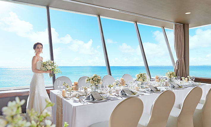 ホテル内にあるパーティー会場は、美しいターコイズブルーのパノラミックオーシャンビュー。地元グアムの食材を中心とした美しい料理を囲んで、ゲストの皆さまと心温まる素敵なパーティーを。