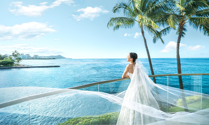 ホノルルの海とダイヤモンドヘッドを一望するふたつのチャペル。まるで海の上に浮いているかのようなパーティー会場。大理石の大階段に、花が咲き誇るセレブレーションガーデン。
