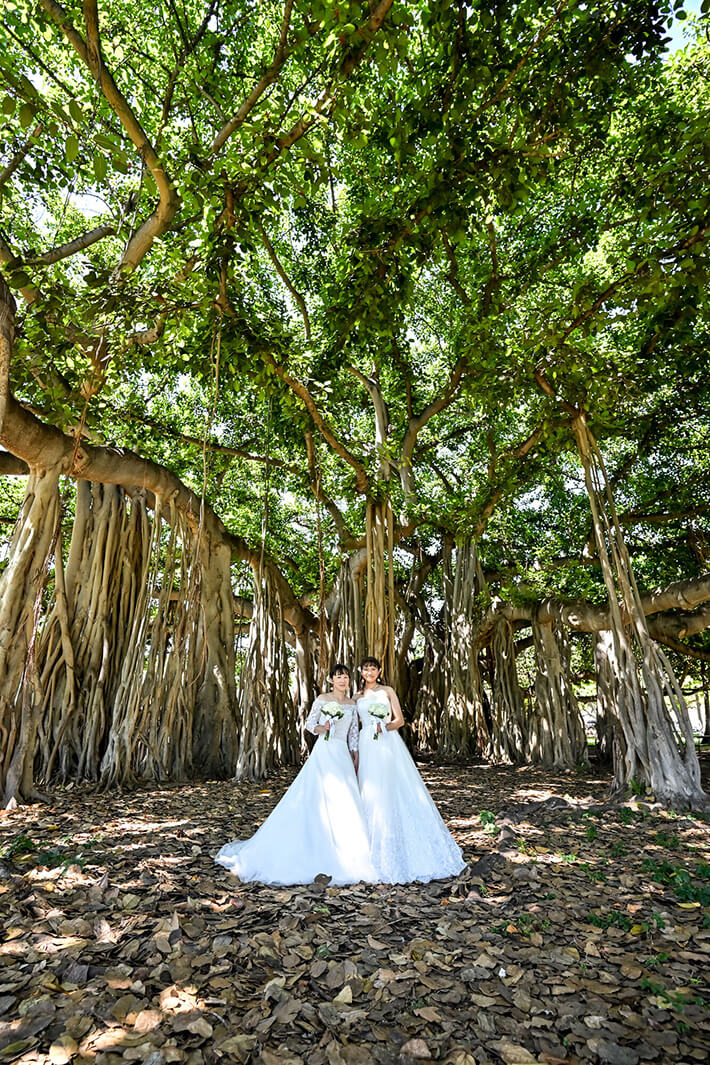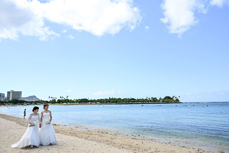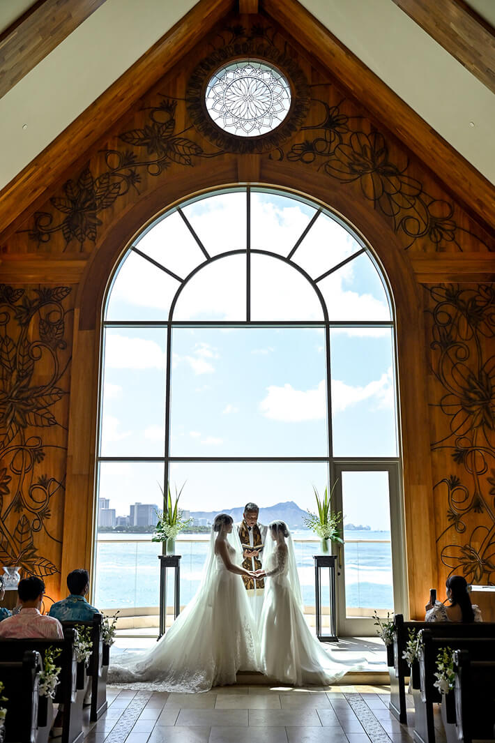 一度は行ってみたいと思っていた憧れのエリアでした。直行便が出ていて、日本語も通じやすい、天候も良いなど親族のことも招待しやすい旅先でした。式場は、コアウッドの彫刻に惹かれ、ハワイの温かみを感じられる素敵なチャペルだと思ったからです。また、海とダイヤモンドヘッドの両方が望めるところにも魅力を感じました。天候に左右されない室内でゆったりと式を行いながらも、自然を感じられるリゾートウエディングの良さも兼ね備えているのが私達の好みに合っていました。有名レストランが併設していたのでお食事にも期待がもてました。実際に行ってみると立地もプライベート感があって良かったです。
