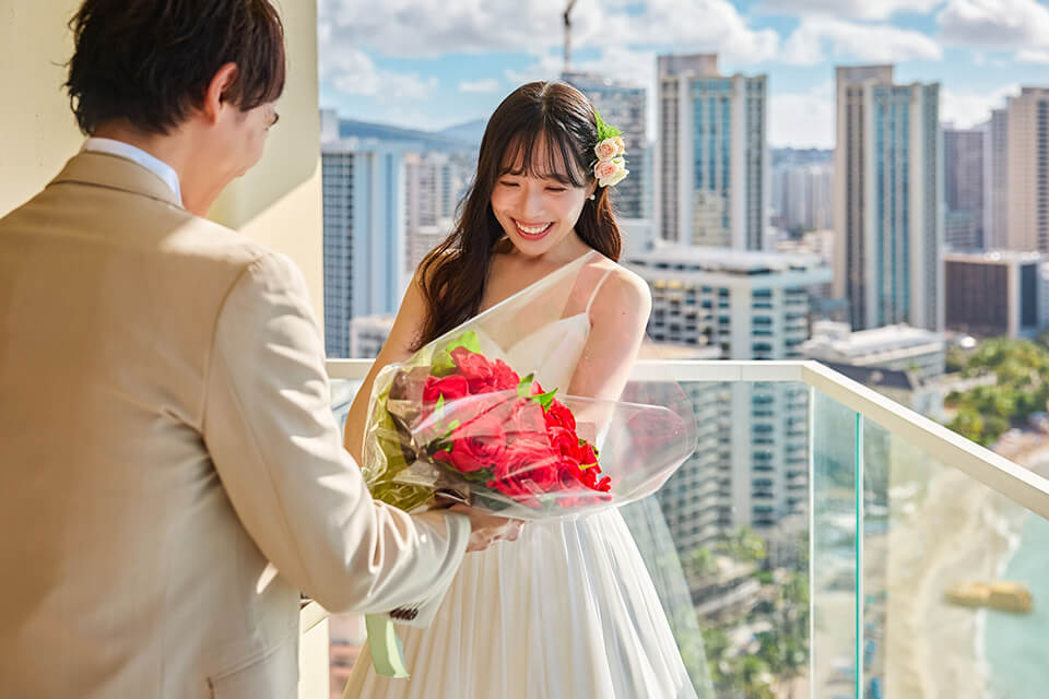 (あまり参考にならないかもしれませんが…)どちらも幼少期をハワイで過ごした経験があるため、互いの共通点となっている地で結婚式を挙げたいと思っていました。いずれの両親もハワイが大好きだったため、最初からハワイに決めて検討しました。