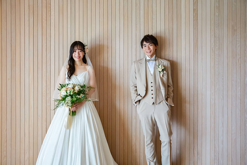 ドレスはシンプルなものを選び、生花の髪飾りもつけてリゾートらしさを出しました。タキシードもハワイらしく、またチャペルの色合いとマッチするブラウンカラーを選びました。また、ドレスは上からベストを被ることができるもの、タキシードは中のベストがリバーシブルになっているもので、着替えずに雰囲気を変えることができるものを選びました。お色直しの予定がなかったので、1着で雰囲気を変えられる衣装はとても魅力的でした!