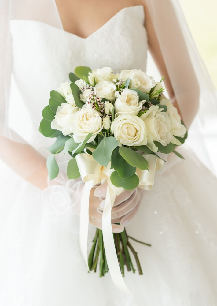 琉球ガラスのバージンロードに映えるよう、真っ白なドレスと長いベールを選びました。