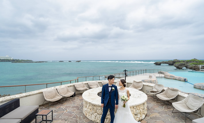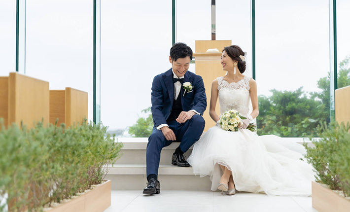 当初はハワイ挙式を決定していましたが、コロナ禍で渡航が厳しくなったため、私たちの思い出の地でもある沖縄に変更することにしました。式場は、きれいな海が見えることと、白を基調に木目と生花の緑が非常にきれいに映える内観が気に入って選びました。私たちは当日強風の影響でできませんでしたが、挙式後、外でカクテルパーティーを楽しめ、参列者と海をバックに写真を撮れることもポイントでした。