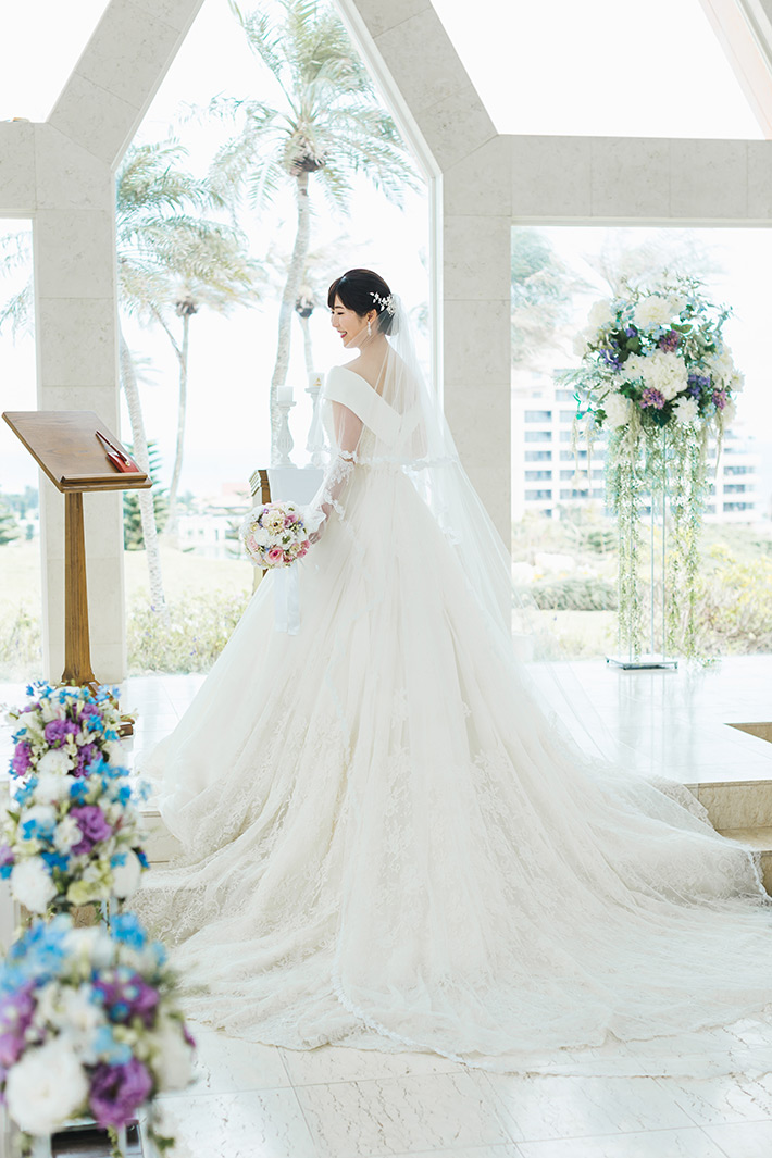 新婦のドレスは、自分の体型に合うAラインのものを選択、スカートは雰囲気にあったふんわりとした素材のものに決めました。ビーチ撮影ではスカートやドレープのレースが風になびいてとても好評でした。新郎は、新婦のドレスを引き立たせるような色・風合い・デザインを選びました。参列者は、全員レンタルのかりゆしを私たちが用意し、現地配布・返却としました。